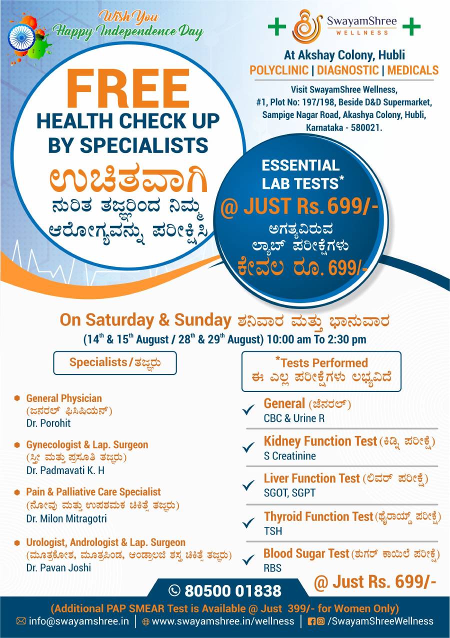 Address - SwayamShree Wellness (Unit of Swayamshree Enterprises), #1, Plot No: 197/198, Sampige Nagar Road, Akshay Colony, Hubli, Karnataka-580021.